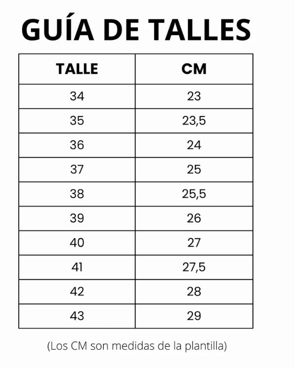 Antes de realizar la compra, verificá cuidadosamente el talle con la medida de la plantilla, ya que no se aceptan devoluciones ni cambios por elección de talle incorrecta.